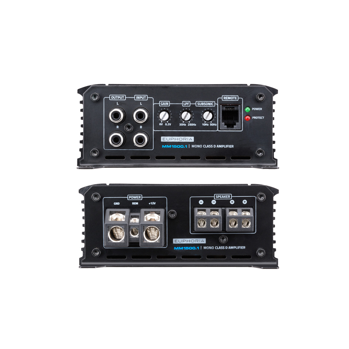 AMPLIFICADOR MONO LINEA EUPHORIA. 1 X 1500W @ 1 OHMS. 1 X 750W @ 2 OHMS. 1 X 325W @ 4 OHMS. BASS REMOTE INCLUIDO.